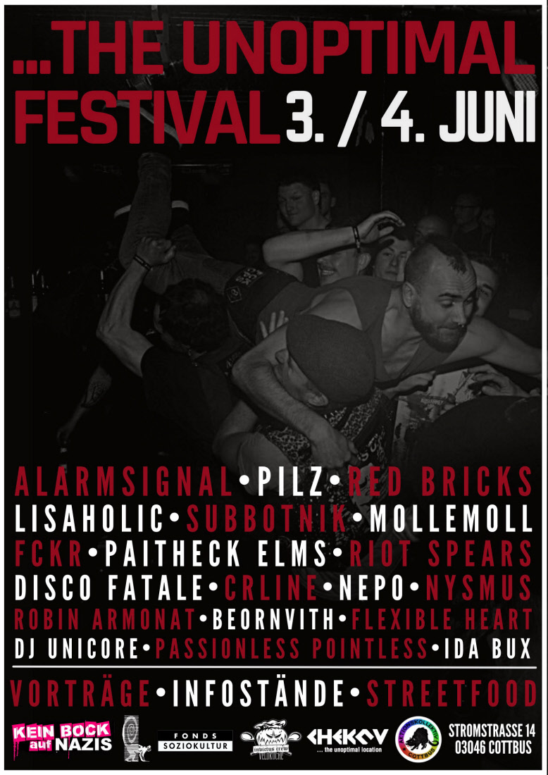 "Anlässlich des 28 Geburtstages unseres Jugendklubs Chekov haben wir uns überlegt, ein Festival ganz nach unserem Geschmack auf die Beine zu stellen. Dabei sollen alle Subkulturen vertreten sein, die in all den vergangenen Jahren ein Zuhause im Chekov gefunden haben. Vom 03. bis zum 04.06.2022 veranstalten wir also unser erstes eigenes Festival unter dem Namen "the unoptimal Festival". Laut, chaotisch und wild soll es werden, eben so wie ihr es von uns kennt.