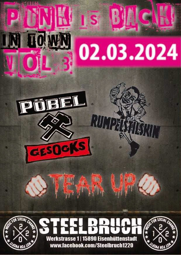 << Zurück 2.März 2024 - Pöbel Und Gesocks + Rumpelstilskin + Tear Up LIVE @Steelbruch / Eisenhüttenstadt Vorverkauf / Ticket